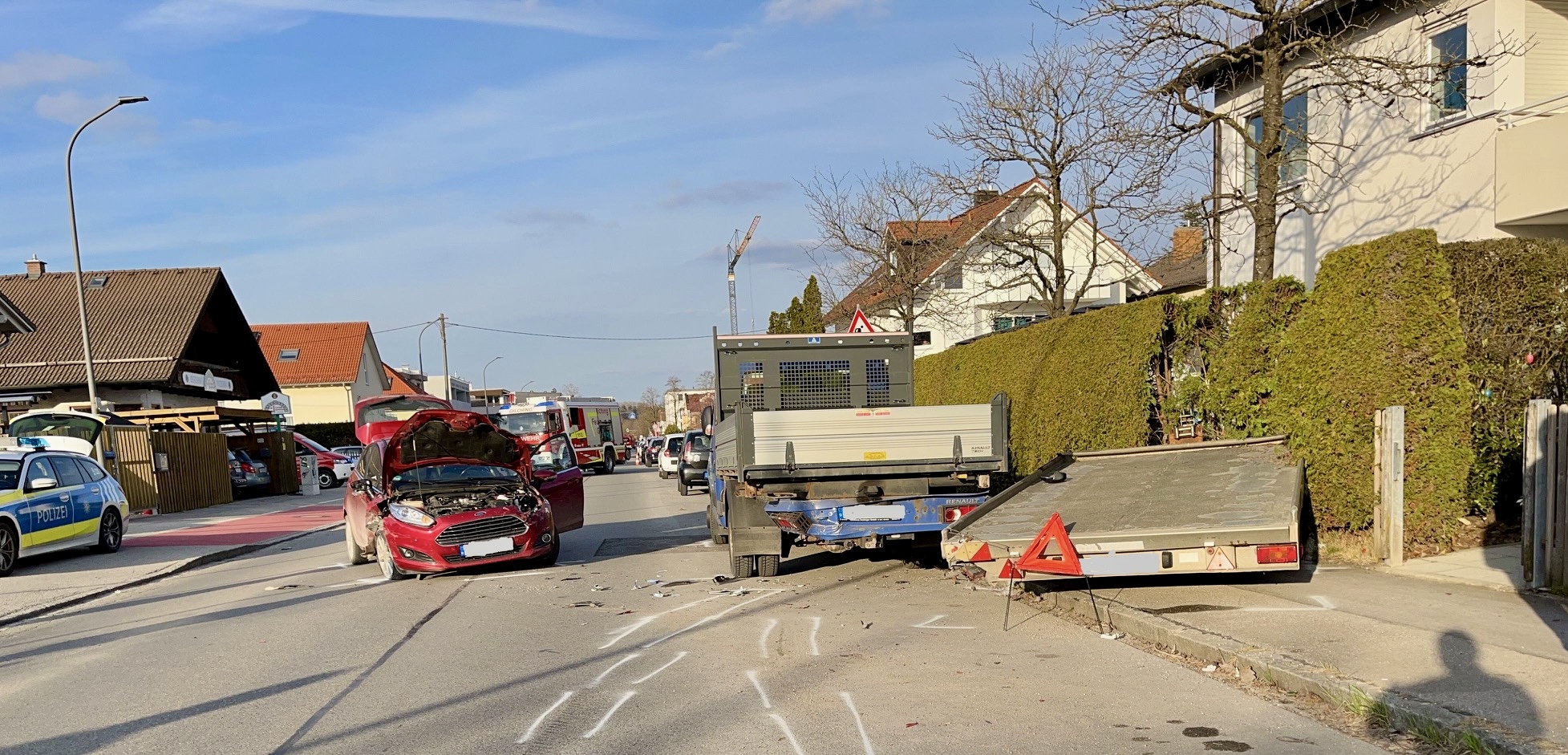 Eine 78-jährige Dame aus Weßling fuhr am Samstag mit ihrem Pkw die Landsberger Straße stadteinwärts. Etwa 50 Meter hinter der Einmündung „Am Stockerfeld“ geriet sie mit ihrem Fahrzeug zu weit nach rechts und fuhr in einen am rechten Fahrbahnrand abgestellten Anhänger. Dieser wurde durch den Zusammenstoß in eine Thujenhecke eines angrenzenden Grundstücks geschoben. Durch die Wucht des Zusammenstoßes drehte sich der Pkw der 78-Jährigen, sodass das Fahrzeug mit der linken Fahrzeugfront gegen das Heck eines am Fahrbahnrand geparkten Lkws stieß.
