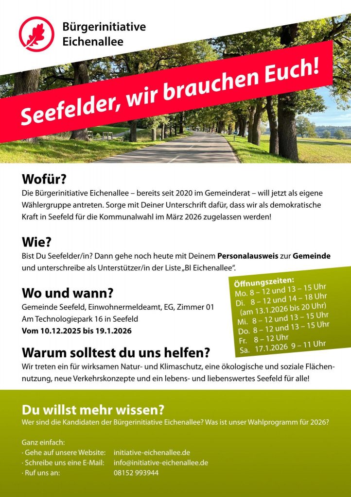 Seefeld – Die Bürgerinitiative Eichenallee, die seit 2020 mit drei Mitgliedern im Gemeinderat Seefeld vertreten ist, hat den formalen Prozess eingeleitet, um bei der Kommunalwahl im März 2026 als eigene Wählergruppe anzutreten. Für eine Zulassung zur Wahl werden 120 Unterstützungsunterschriften wahlberechtigter Bürgerinnen und Bürger aus Seefeld benötigt. Eintragungen in die Unterstützungsliste sind im Einwohnermeldeamt der Gemeinde ab sofort bis zum 19. Januar 2026 möglich. Ein gültiger Personalausweis ist hierfür erforderlich.