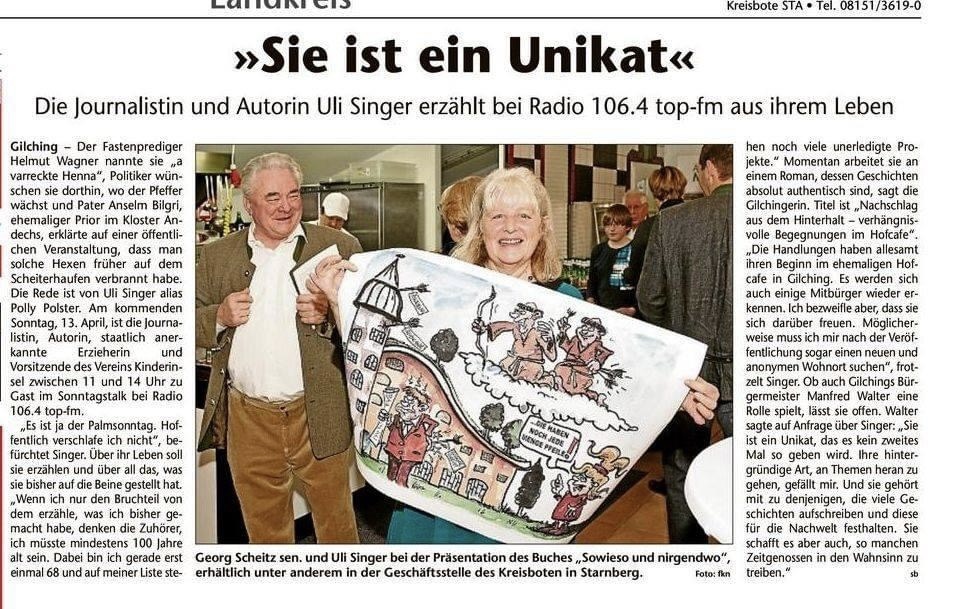 So, im Artikel wird noch einmal daran erinnert, dass mich der ehemalige Prior von Andechs, Pater Anselm, auf den Scheiterhaufen schicken wollte, uns sehr geschätzter Helmut Wagner mich mit einer „varreckten Henna“ verglich und selbst Gilchings Bürgermeister von einem Unikat schwärmte… Echt! Hat er… Wenn er das jetzt liest… hihi. Ihr wisst schon warum?!? Aber dazu später mehr…