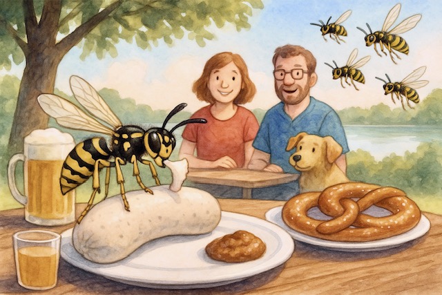 Frieda, nahe dem Wesslinger See in einem gemütlichen Wespenstock zuhause, machte sich, den Duft von kulinarischen Leckereien in der Nase, Richtung Cafe am See auf und landete zielsicher bei zwei freundlichen Menschen aus der Nachbargemeinde Gilching – Polly und Matt –, die es sich gerade bei ein Paar Weißwürsten mit süßem Senf und Butter-Brezn gutgehen ließen