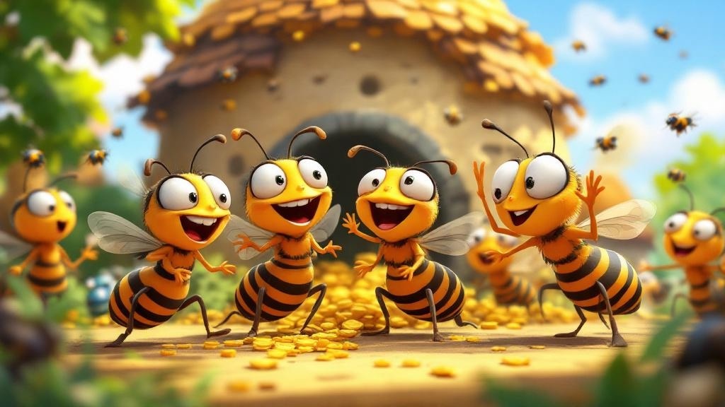 „Hör doch mal“, machte Matt Polly plötzlich aufmerksam. Keine fünf Minuten später nämlich summte es über den Köpfen der Gäste. Friedas Kollegen und Kolleginnen – Berta, Bine, Wanda und der dicke Willibald – waren im Anflug, schnupperten kurz suchend durch die Luft und landeten ebenfalls auf dem Tisch von Polly und Matt. Doch, oh Schreck – es war zu spät! Die Weißwürste waren längst verputzt. Zurück geblieben waren lediglich noch vereinzelte Senfspuren auf den benutzten Servietten und die Rechnung für ein gemütliches Frühstück.