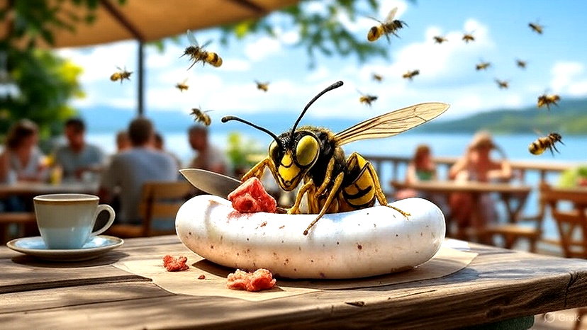 Wessling – Es war ein sonniger Morgen am Wesslinger See, als Frieda, eine neugierige Wespe mit einem besonders feinen Rüssel, auf Frühstückssuche ging. Sie summte über das Wasser, prüfte hier ein Stück Kuchen, dort einen Apfelsaft – aber nichts kitzelte ihre Geschmacksknospen so wie der Duft, der plötzlich vom Café herüberwehte. „Fleisch? Wurst? Weißwurst!“, zirpte Frieda, riss sich die imaginäre Serviette vom Hals und machte einen Looping vor Begeisterung. “Heute gibt’s kein Obst und keinen Kuchen – heute gibt’s bayerisches Frühstück!”