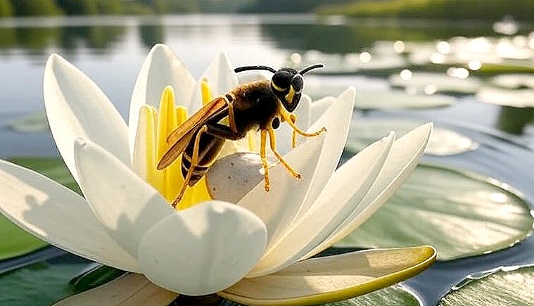 Frieda aber saß gemütlich auf einem Seerosenblatt auf dem See und ließ sich ihr letztes geklautes Stückchen Weißwurst schmecken. Gleichzeitig aber notierte sie mit etwas Wespenstaub auf ihrem ausgebreiteten Flügel: „Nicht vergessen! Morgen, pünktlich neun Uhr – Richtung Café am Wesslinger See starten.“