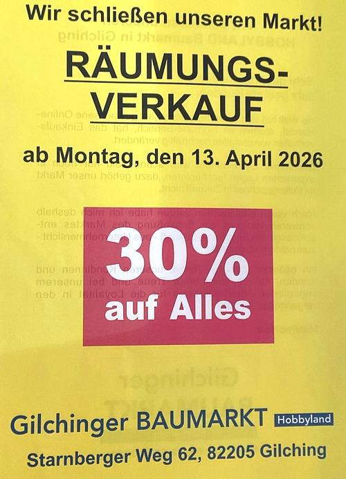 Gilchinger Baumarkt schließt – Räumungsverkauf ab Montag
