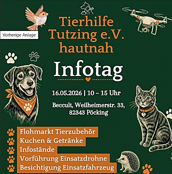 Pöcking – Wie vielseitig moderner Tierschutz heute ist, zeigt die Tierhilfe Tutzing e.V. am Samstag, 16. Mai, von 10 bis 15 Uhr bei einem Infotag im Beccult in Pöcking. Unter dem Motto „Tierhilfe Tutzing hautnah“ können Besucher einen Blick hinter die Kulissen ehrenamtlicher Tierrettung werfen – mit spannenden Einblicken, Vorführungen und Begegnungen.